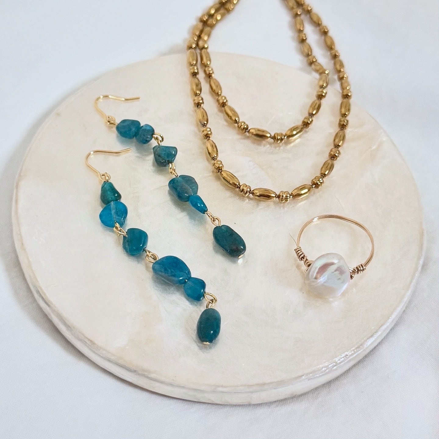 一粒づつ形や色味が微妙に異なるアパタイトを使用したシンプルなラインピアス。