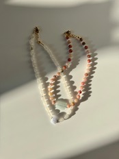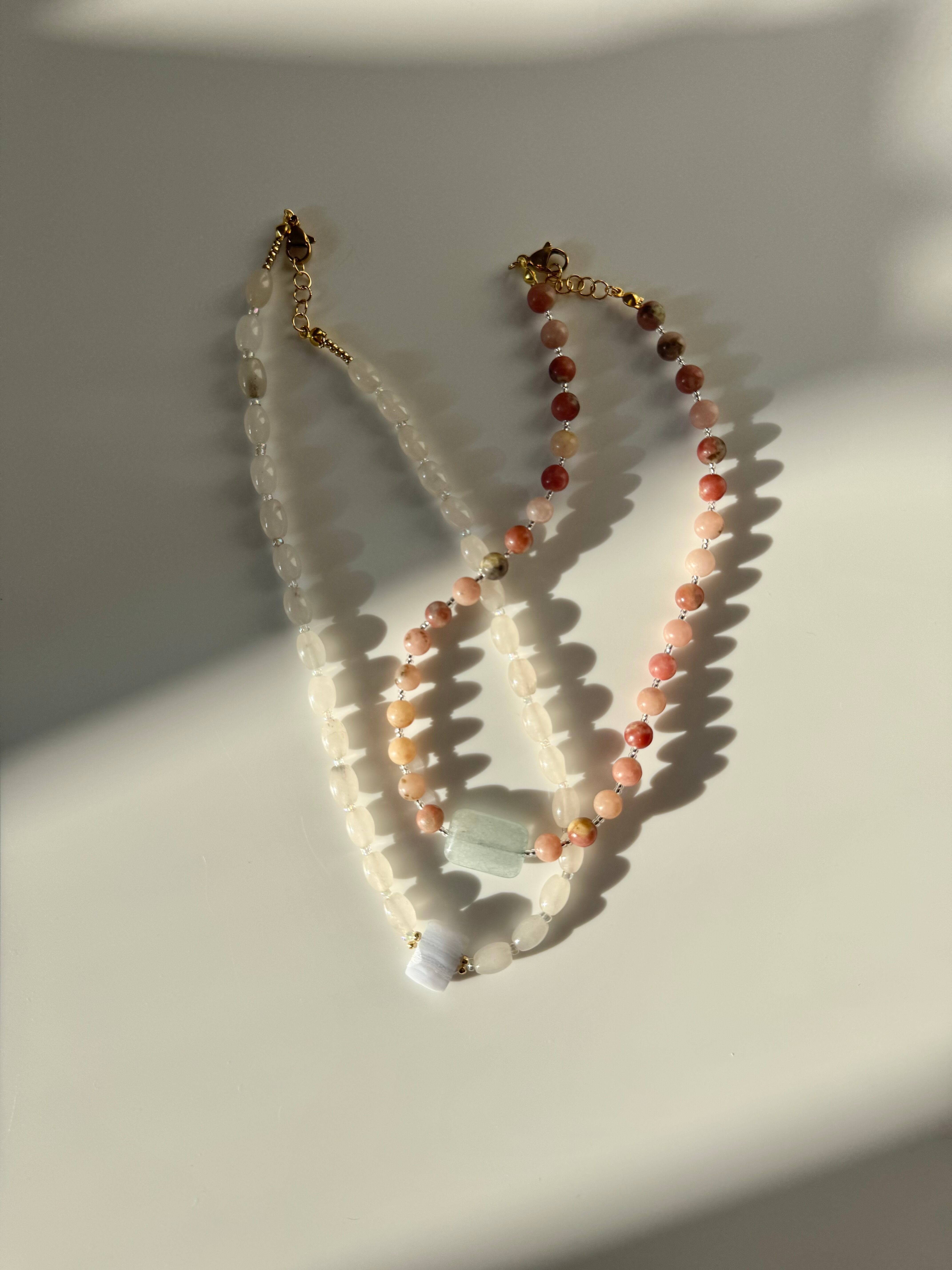 一粒づつ表情の異なるくすみピンクカラーのアゲートには存在感たっぷりの淡いミントカラーのジェード。長さ 約36㎝